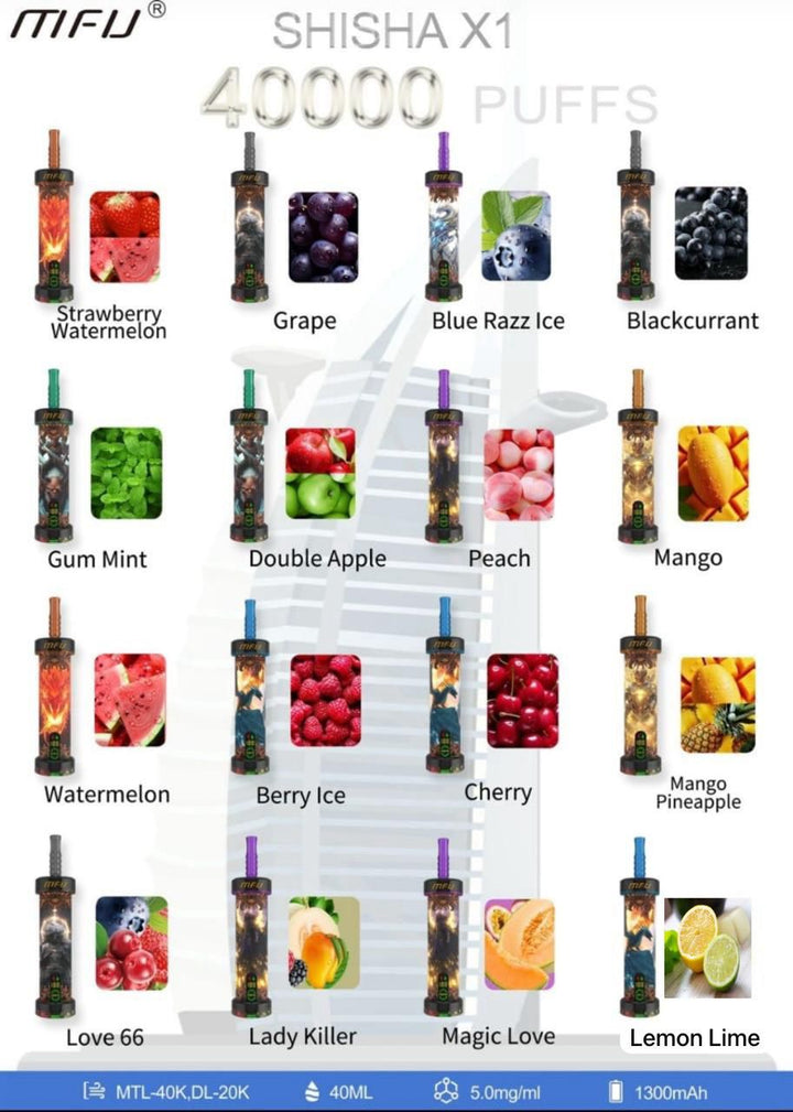 The MFU Shisha X1 40000 Puffs Disposable Vape is a cutting-edge vaping device crafted for users seeking power, performance, and longevity in one sleek design. Built to deliver an extraordinary 40,000 puffs, this device outshines competitors with its massive e-liquid capacity and rechargeable 1400mAh battery — ensuring your vaping sessions last longer than ever before.